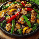 Colorful teriyaki chicken stir-fry is a vibrant dish that combines tender chicken pieces with an array of colorful vegetables. The dish gets its flavor from a homemade or store-bought teriyaki sauce, which adds a sweet and savory taste. Typically, bell peppers, broccoli, and carrots are used, providing both visual appeal and nutritional benefits. This dish not only satisfies your taste buds but also offers a balanced meal packed with protein and vitamins.