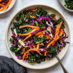 Tossing It All Together: In a large mixing bowl, combine chopped kale, shredded carrots, red cabbage, and green onions. Pour the dressing over this colorful medley. Now comes the fun part: get in there with your hands! Massage the kale gently until it’s coated well—this step wilts the kale slightly for easier eating.