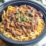 Keywords: - For extra flavor, sear the beef before adding it to the crockpot. - Substitute egg noodles with rice or zoodles for a low-carb option. - Add vegetables like carrots or peas for added nutrition.
