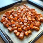 Spread the coated sweet potatoes evenly on your prepared baking sheet. Give them space to breathe—nobody wants soggy potatoes at this party!